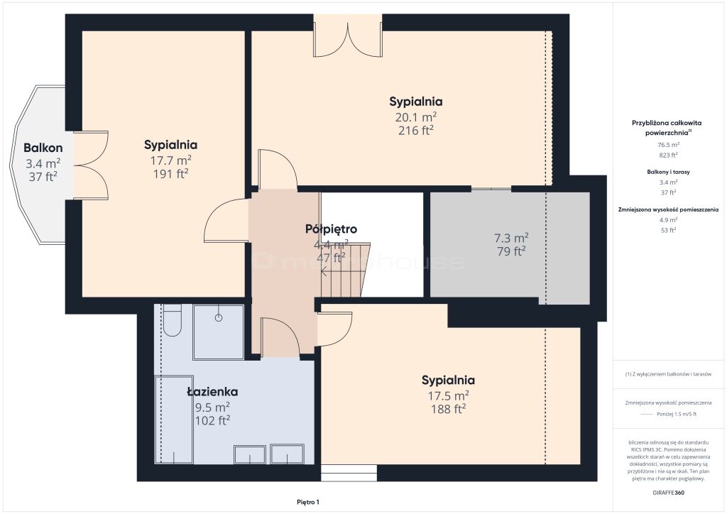 Na piętrze czekają trzy przytulne sypialnie, jedna z nich z garderobą i klimatyzacją oraz łazienka z wanną i prysznicem.